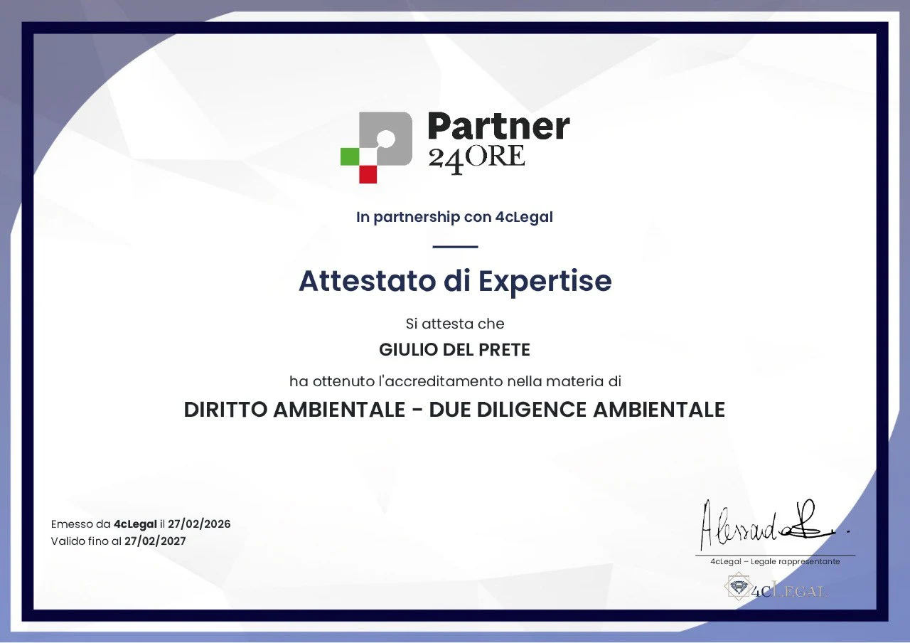 Da febbraio 2026, l'avvocato Del Prete è accreditato quale Partner Sole24Ore nella materia di "DIRITTO AMBIENTALE - DUE DILIGENCE AMBIENTALE".